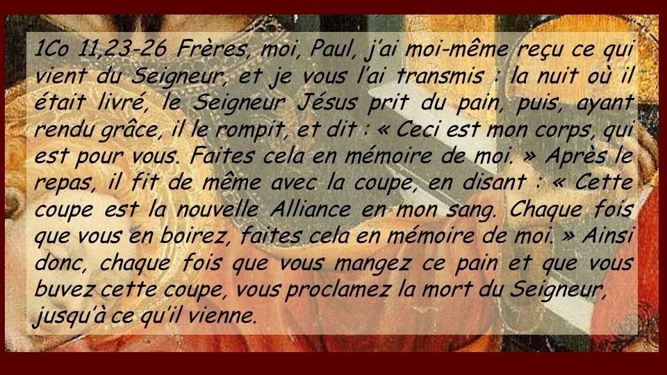 Ainsi donc, chaque fois que vous mangez ce pain et que vous buvez cette coupe, vous proclamez la mort du Seigneur, jusqu’à ce qu’il vienne.