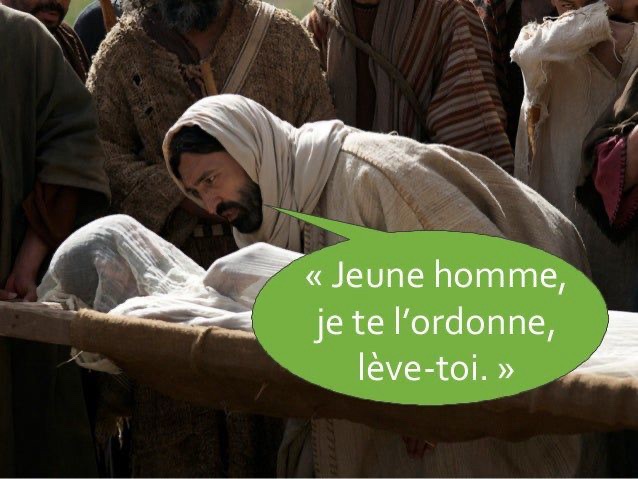 Il s’approcha et toucha le cercueil ; les porteurs s’arrêtèrent, et Jésus dit : « Jeune homme, je te l’ordonne, lève-toi. »