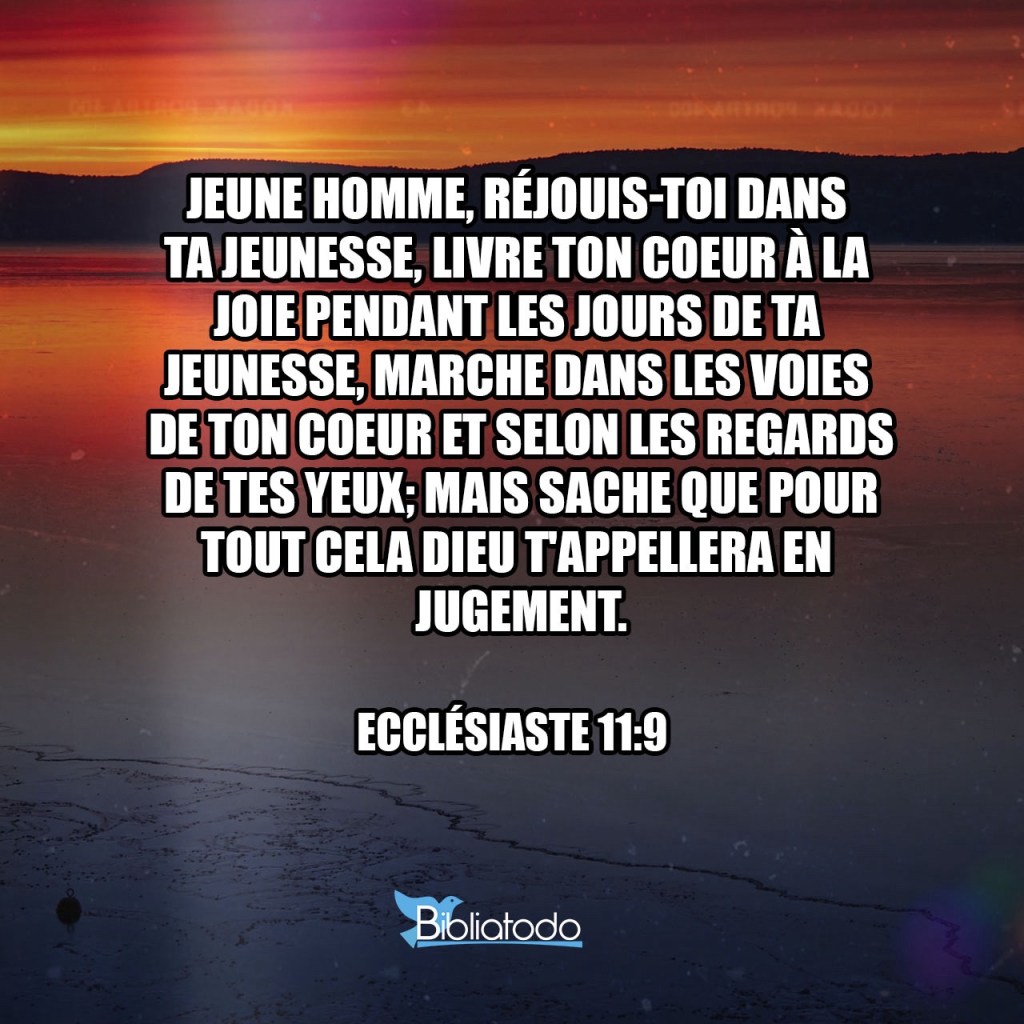 Réjouis-toi, jeune homme, dans ton adolescence, et sois heureux aux jours de ta jeunesse. Suis les sentiers de ton cœur et les désirs de tes yeux ! Mais sache que pour tout cela Dieu t’appellera en jugement.