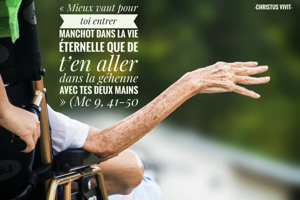 Et si ta main est pour toi une occasion de chute, coupe-la. Mieux vaut pour toi entrer manchot dans la vie éternelle que de t’en aller dans la géhenne avec tes deux mains, là où le feu ne s’éteint pas.