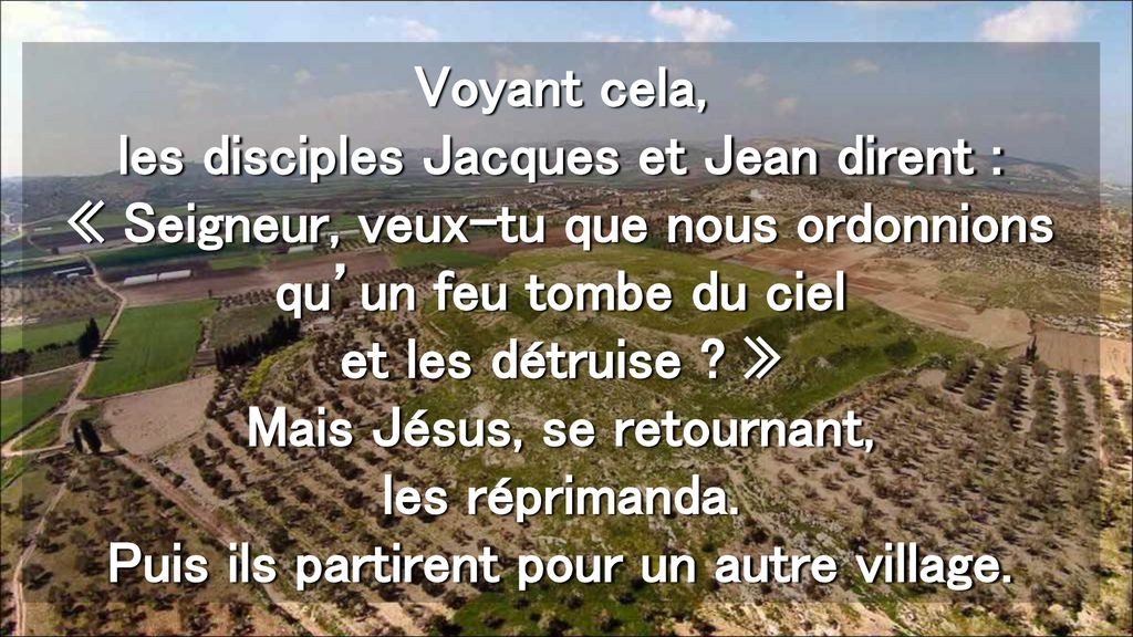 Voyant cela, les disciples Jacques et Jean dirent : « Seigneur, veux-tu que nous ordonnions qu’un feu tombe du ciel et les détruise ? »
