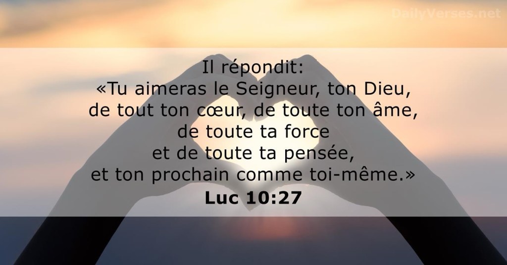 L’autre répondit : « Tu aimeras le Seigneur ton Dieu de tout ton cœur, de toute ton âme, de toute ta force et de toute ton intelligence, et ton prochain comme toi-même. »