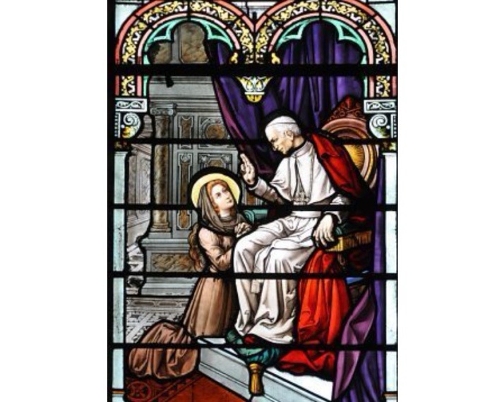 Vitrail de la basilique Notre Dame de Lourdes à Nancy : (baie 31) Au Vatican, la future sainte brise le protocole et vient implorer à genoux le pape pour avoir le droit d’entrer au Carmel de Lisieux malgré ses quinze ans ( https://www.patrimoine-histoire.fr/P_Lorraine/Nancy/Nancy-Notre-Dame-de-Lourdes.htm).