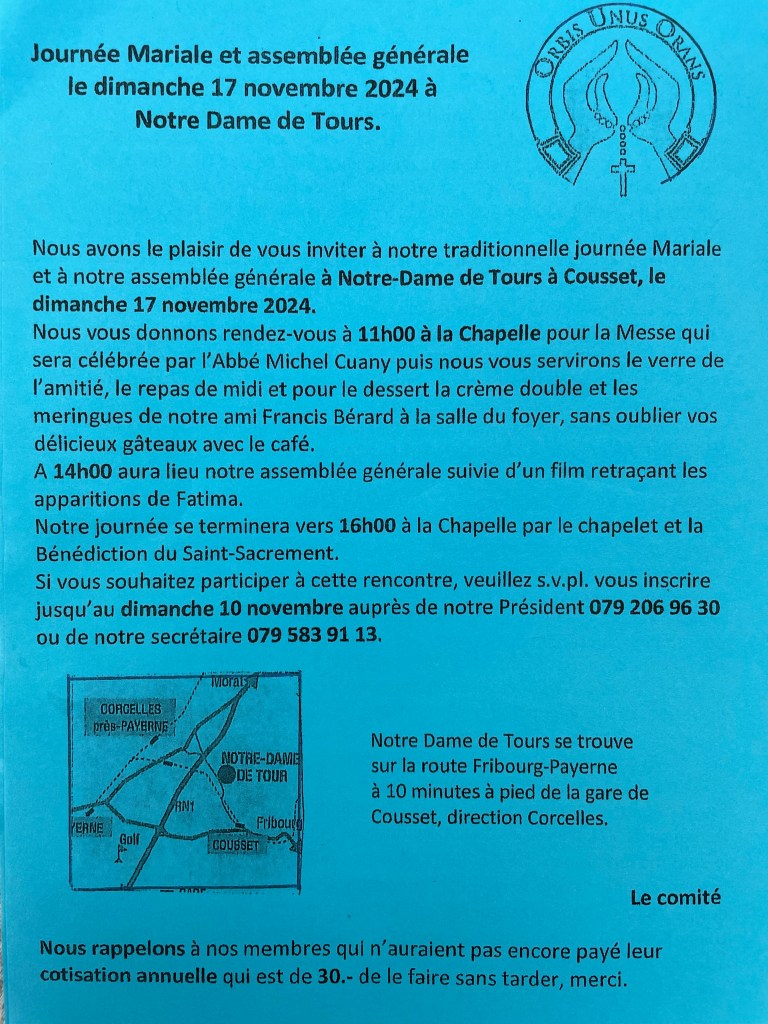 MESSAGE D’AUTOMNE DU CRAMF (mots du président et de l’aumônier – Journée mariale et AG du CRAMF) 25 octobre 2024 ndfatima Partager : Cliquer pour partager sur X(ouvre dans une nouvelle fenêtre) X Cliquez pour partager sur Facebook(ouvre dans une nouvelle fenêtre) Facebook Plus Cliquez pour partager sur WhatsApp(ouvre dans une nouvelle fenêtre) WhatsApp Cliquer pour envoyer un lien par e-mail à un ami(ouvre dans une nouvelle fenêtre) E-mail J’aime chargement… Publié par ndfatima Administrateur Voir tous les articles par ndfatima