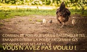 Jérusalem, Jérusalem, toi qui tues les prophètes et qui lapides ceux qui te sont envoyés, combien de fois ai-je voulu rassembler tes enfants comme la poule rassemble ses poussins sous ses ailes, et vous n’avez pas voulu !