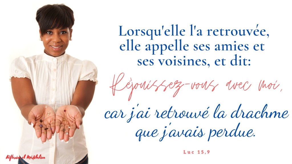 Quand elle l’a retrouvée, elle rassemble ses amies et ses voisines pour leur dire : “Réjouissez-vous avec moi, car j’ai retrouvé la pièce d’argent que j’avais perdue !”