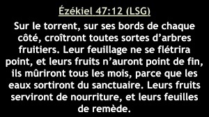 Au bord du torrent, sur les deux rives, toutes sortes d’arbres fruitiers pousseront ; leur feuillage ne se flétrira pas et leurs fruits ne manqueront pas. Chaque mois ils porteront des fruits nouveaux, car cette eau vient du sanctuaire. Les fruits seront une nourriture, et les feuilles un remède. »