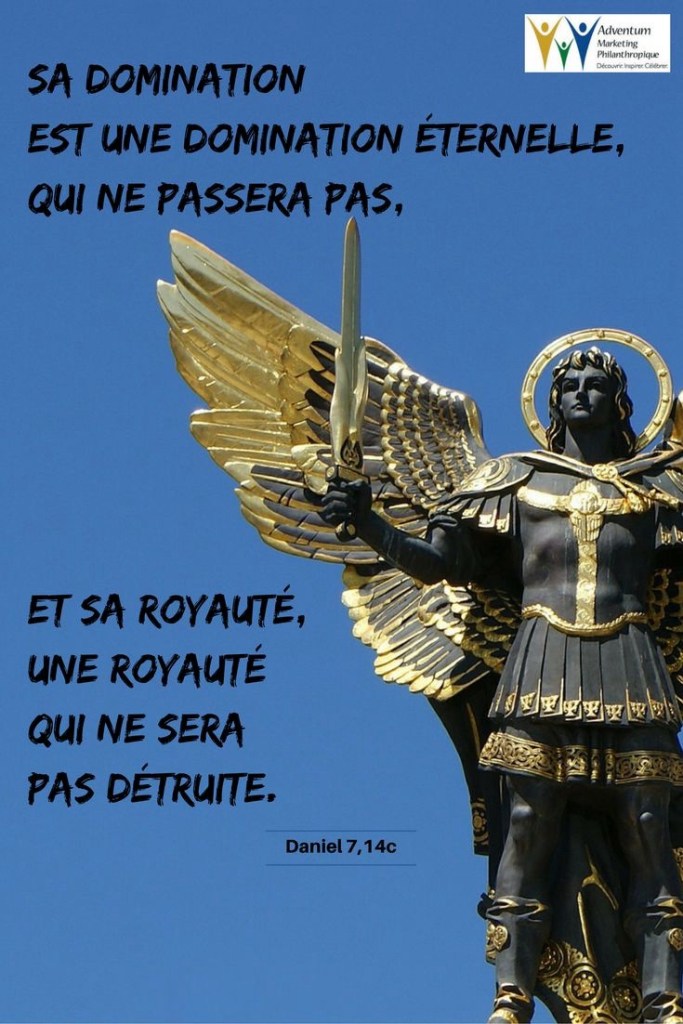 Et il lui fut donné domination, gloire et royauté ; tous les peuples, toutes les nations et les gens de toutes langues le servirent. Sa domination est une domination éternelle, qui ne passera pas, et sa royauté, une royauté qui ne sera pas détruite.