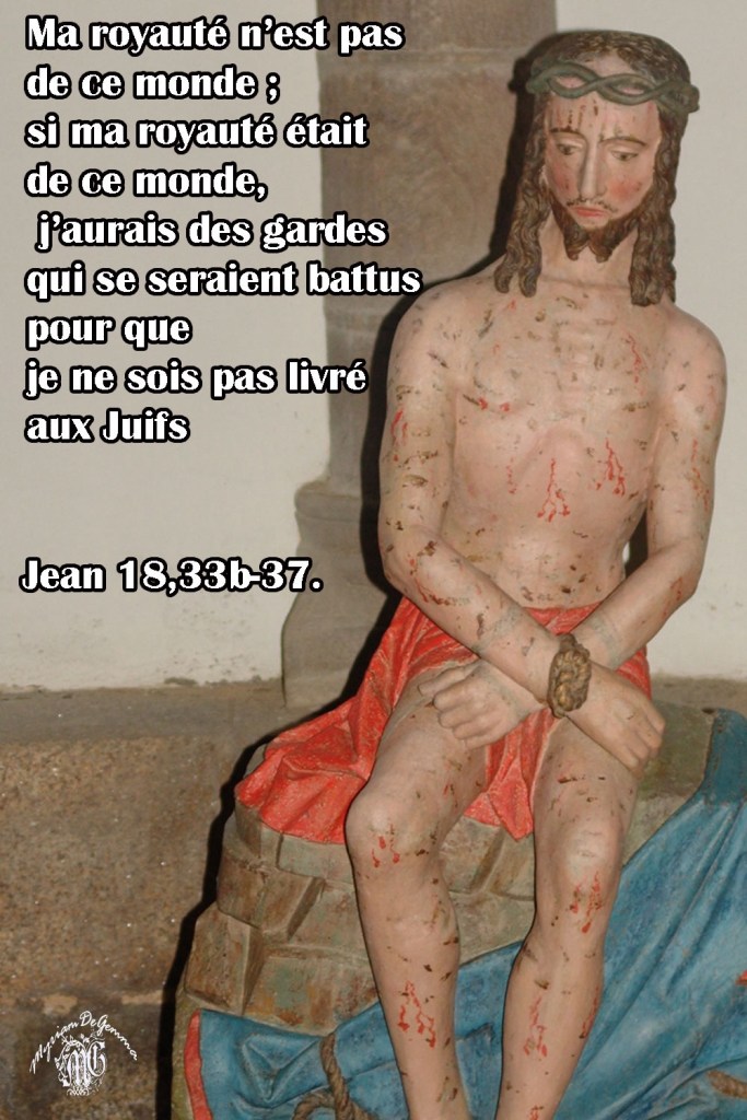 Jésus déclara : « Ma royauté n’est pas de ce monde ; si ma royauté était de ce monde, j’aurais des gardes qui se seraient battus pour que je ne sois pas livré aux Juifs.
