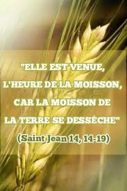 Un autre ange sortit du Sanctuaire. Il cria d’une voix forte à celui qui siégeait sur la nuée : « Lance ta faucille et moissonne : elle est venue, l’heure de la moisson, car la moisson de la terre se dessèche. »