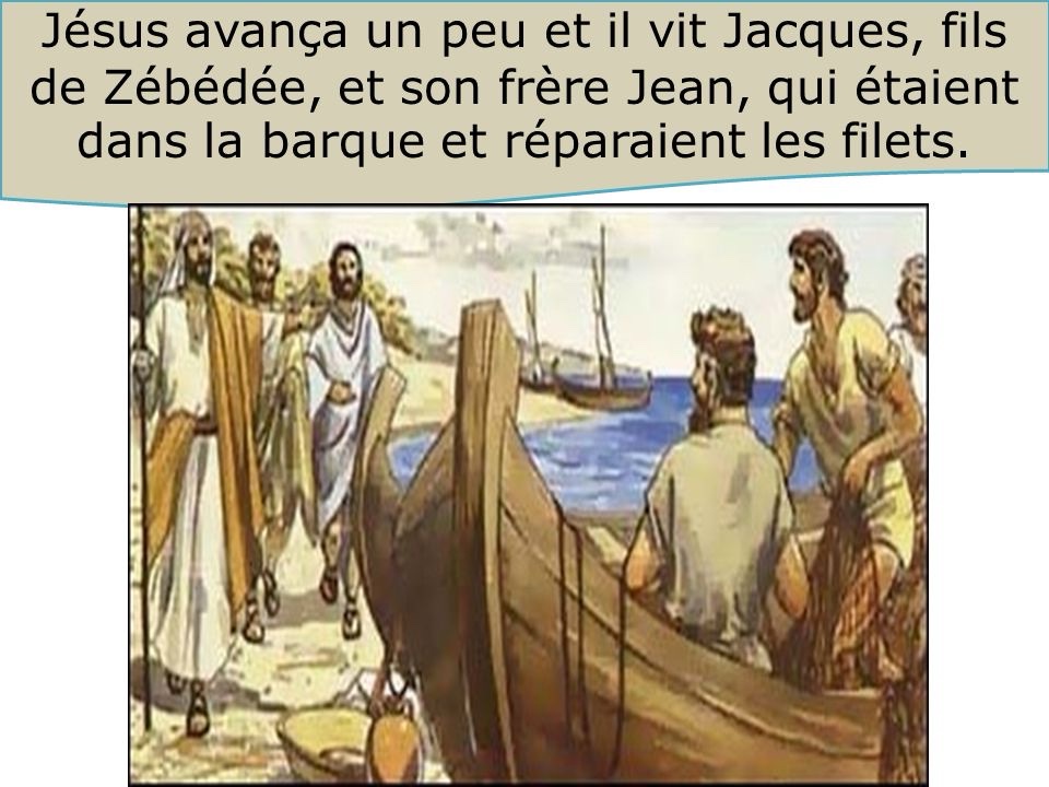 De là, il avança et il vit deux autres frères, Jacques, fils de Zébédée, et son frère Jean, qui étaient dans la barque avec leur père, en train de réparer leurs filets. Il les appela.
