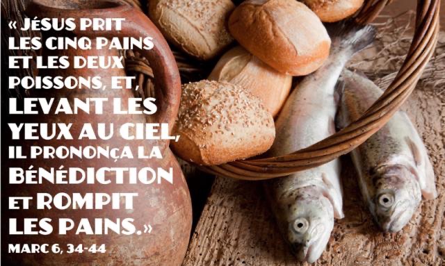 Il prit les sept pains et les poissons ; rendant grâce, il les rompit, et il les donnait aux disciples, et les disciples aux foules.