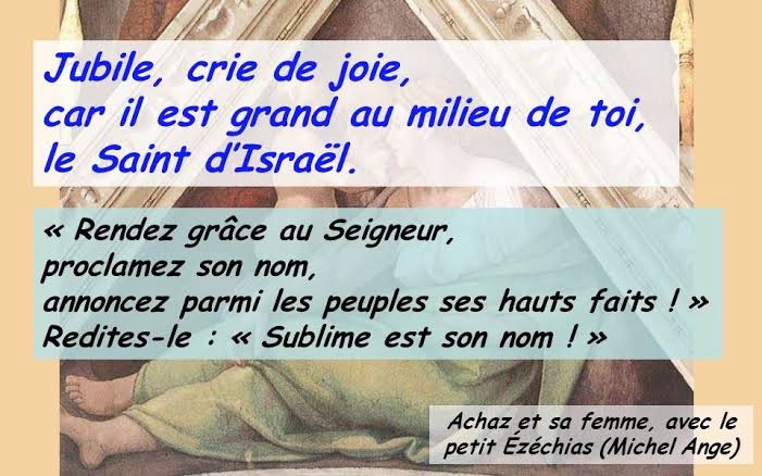 R/ Jubile, crie de joie, car il est grand au milieu de toi, le Saint d’Israël. (Is 12, 6)