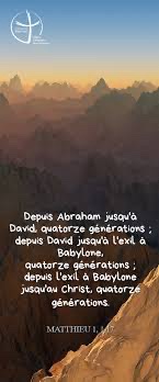 Le nombre total des générations est donc : depuis Abraham jusqu’à David, quatorze générations ; depuis David jusqu’à l’exil à Babylone, quatorze générations ; depuis l’exil à Babylone jusqu’au Christ, quatorze générations.