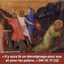 En ce temps-là, Jésus disait à ses disciples : « Méfiez-vous des hommes : ils vous livreront aux tribunaux et vous flagelleront dans leurs synagogues.
