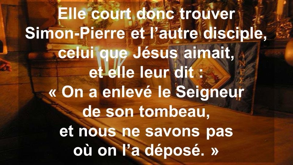 Le premier jour de la semaine, Marie Madeleine courut trouver Simon-Pierre et l’autre disciple, celui que Jésus aimait, et elle leur dit : « On a enlevé le Seigneur de son tombeau, et nous ne savons pas où on l’a déposé. »