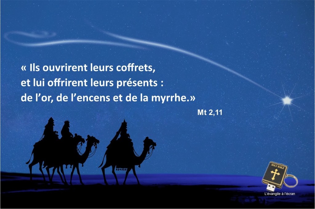 Ils entrèrent dans la maison, ils virent l’enfant avec Marie sa mère ; et, tombant à ses pieds, ils se prosternèrent devant lui. Ils ouvrirent leurs coffrets, et lui offrirent leurs présents : de l’or, de l’encens et de la myrrhe.