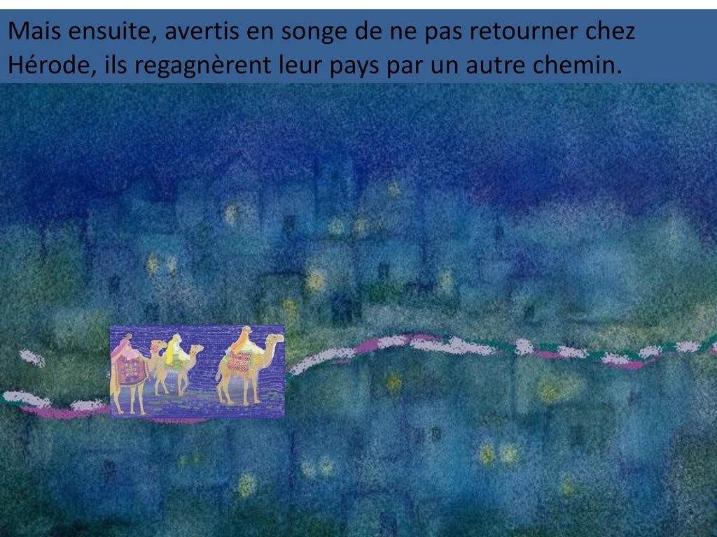 Mais, avertis en songe de ne pas retourner chez Hérode, ils regagnèrent leur pays par un autre chemin.