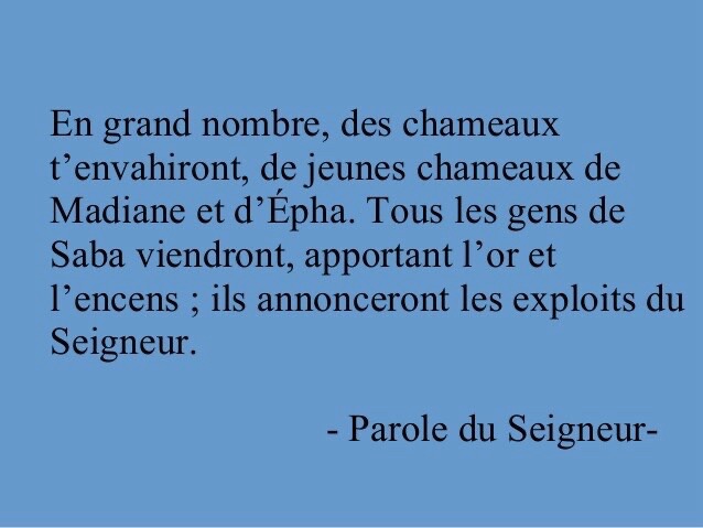 En grand nombre, des chameaux t’envahiront, de jeunes chameaux de Madiane et d’Épha. Tous les gens de Saba viendront, apportant l’or et l’encens ; ils annonceront les exploits du Seigneur.