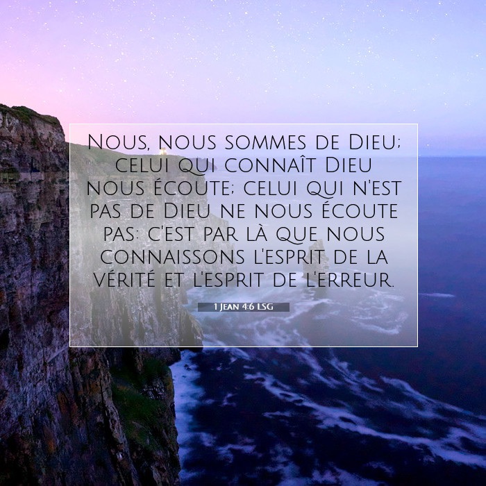 Nous, nous sommes de Dieu ; celui qui connaît Dieu nous écoute ; celui qui n’est pas de Dieu ne nous écoute pas. C’est ainsi que nous reconnaissons l’esprit de la vérité et l’esprit de l’erreur.