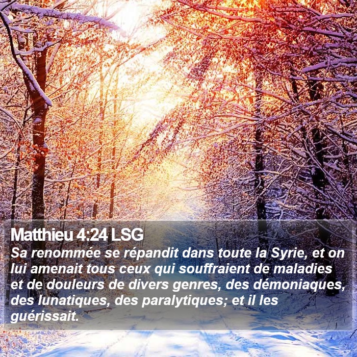 Sa renommée se répandit dans toute la Syrie. On lui amena tous ceux qui souffraient, atteints de maladies et de tourments de toutes sortes : possédés, épileptiques, paralysés. Et il les guérit.