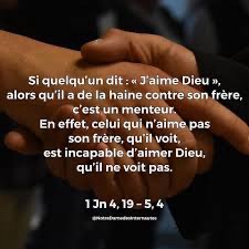 Si quelqu’un dit : « J’aime Dieu », alors qu’il a de la haine contre son frère, c’est un menteur. En effet, celui qui n’aime pas son frère, qu’il voit, est incapable d’aimer Dieu, qu’il ne voit pas.
