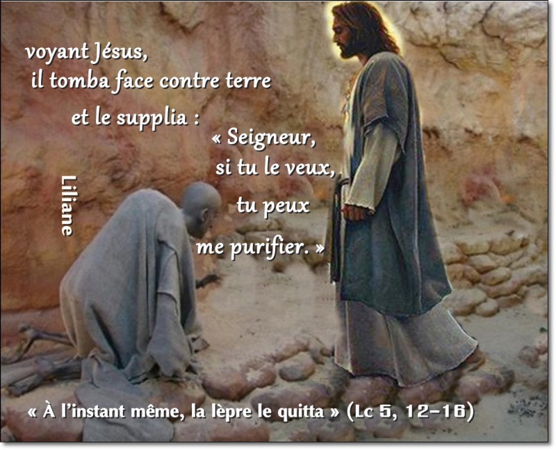 Jésus était dans une ville quand survint un homme couvert de lèpre ; voyant Jésus, il tomba face contre terre et le supplia : « Seigneur, si tu le veux, tu peux me purifier. »