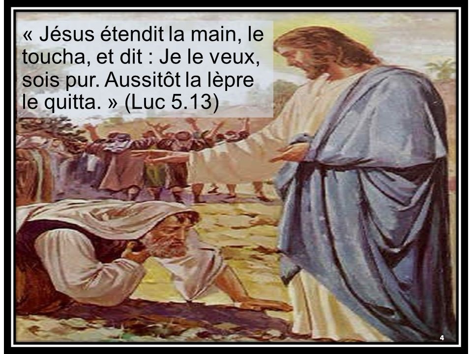Jésus étendit la main et le toucha en disant : « Je le veux, sois purifié. » À l’instant même, la lèpre le quitta.