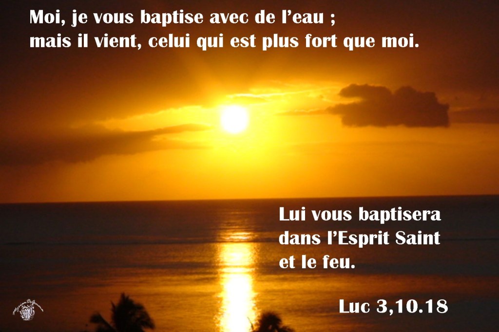 Jean s’adressa alors à tous : « Moi, je vous baptise avec de l’eau ; mais il vient, celui qui est plus fort que moi. Je ne suis pas digne de dénouer la courroie de ses sandales. Lui vous baptisera dans l’Esprit Saint et le feu.
