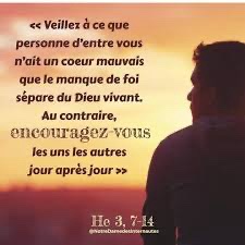 Au contraire, encouragez-vous les uns les autres jour après jour, aussi longtemps que retentit l’« aujourd’hui » de ce psaume, afin que personne parmi vous ne s’endurcisse en se laissant tromper par le péché.