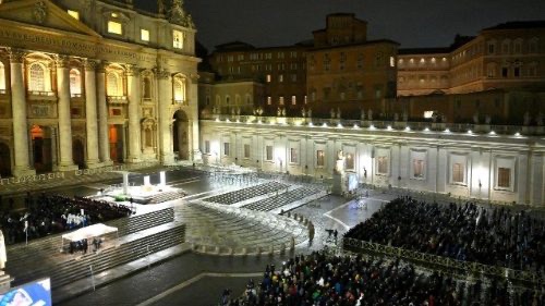 Récitation du Chapelet pour François lundi soir sur la place Saint-Pierre, sous la conduite du secrétaire d’État Pietro Parolin. Des centaines de fidèles, laïcs et religieux, de différentes nationalités, ont prié pour le rétablissement du Souverain pontife. Des cardinaux, des évêques et des membres de la Curie romaine étaient également présents.