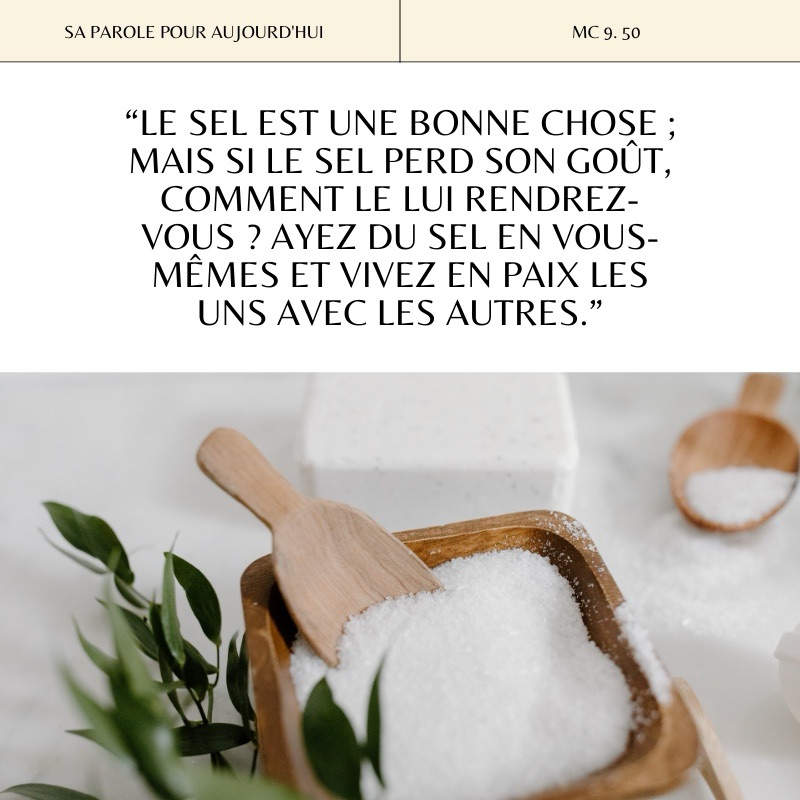 C’est une bonne chose que le sel ; mais s’il cesse d’être du sel, avec quoi allez-vous lui rendre sa saveur ? Ayez du sel en vous-mêmes, et vivez en paix entre vous. »