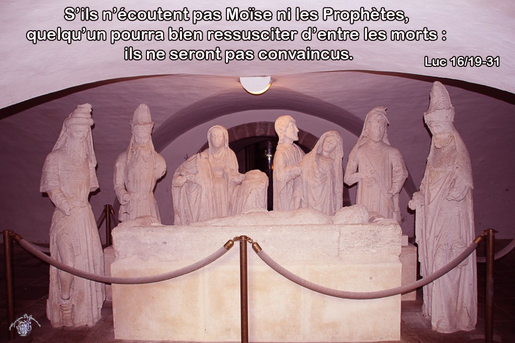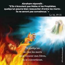 Abraham répondit : “S’ils n’écoutent pas Moïse ni les Prophètes, quelqu’un pourra bien ressusciter d’entre les morts : ils ne seront pas convaincus.” »