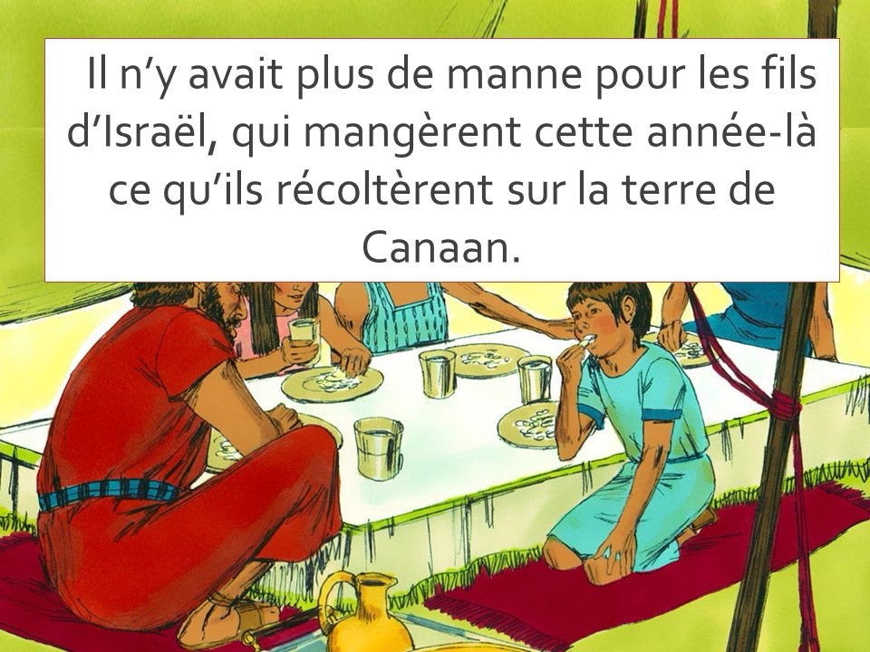 À partir de ce jour, la manne cessa de tomber, puisqu’ils mangeaient des produits de la terre. Il n’y avait plus de manne pour les fils d’Israël, qui mangèrent cette année-là ce qu’ils récoltèrent sur la terre de Canaan.