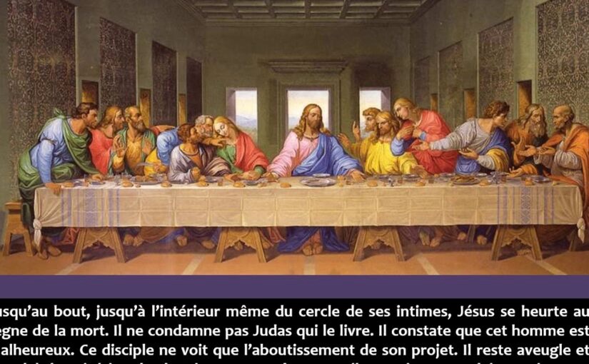 Nous sommes à peu de temps de la fête de la Pâque. Jésus envoie ses disciples pour la préparer. C’est là, au cours du repas qu’il annonce que l’un des siens va le livrer. En réalité, ce n’est pas Judas qui livrait Jésus aux chefs des prêtres ; c’est Jésus qui « se livrait » par amour pour les hommes. Il ne cherche pas à anéantir celui qui le trahit. Il veut la conversion du pécheur et non sa destruction.