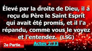 Élevé par la droite de Dieu, il a reçu du Père l’Esprit Saint qui était promis, et il l’a répandu sur nous, ainsi que vous le voyez et l’entendez. »