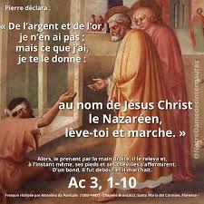 Pierre déclara : « De l’argent et de l’or, je n’en ai pas ; mais ce que j’ai, je te le donne : au nom de Jésus Christ le Nazaréen, lève-toi et marche. »