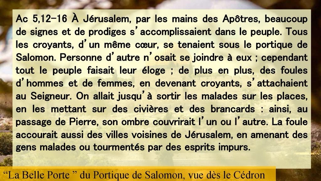 À Jérusalem, par les mains des Apôtres, beaucoup de signes et de prodiges s’accomplissaient dans le peuple. Tous les croyants, d’un même cœur, se tenaient sous le portique de Salomon.