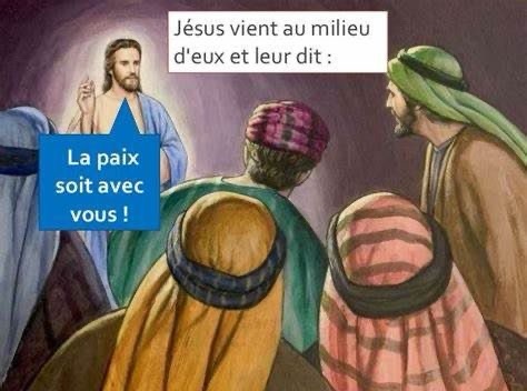 C’était après la mort de Jésus. Le soir venu, en ce premier jour de la semaine, alors que les portes du lieu où se trouvaient les disciples étaient verrouillées par crainte des Juifs, Jésus vint, et il était là au milieu d’eux. Il leur dit : « La paix soit avec vous ! »
