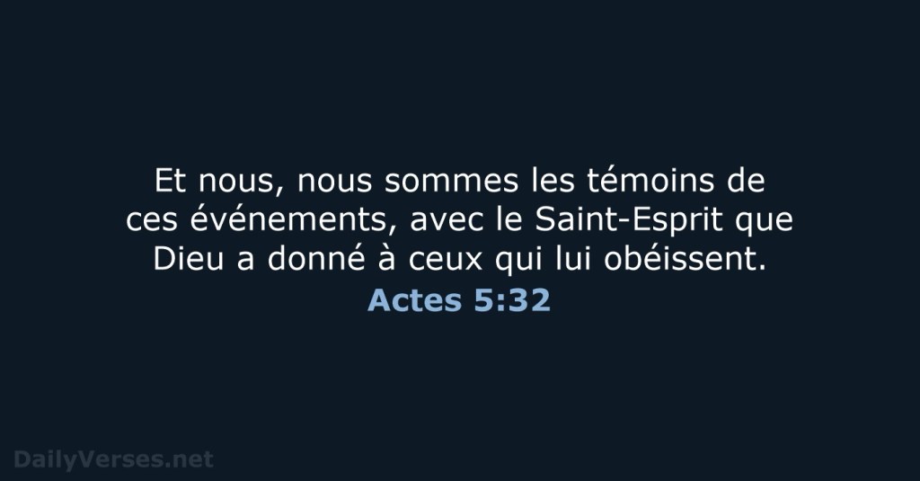 Quant à nous, nous sommes les témoins de tout cela, avec l’Esprit Saint, que Dieu a donné à ceux qui lui obéissent. »