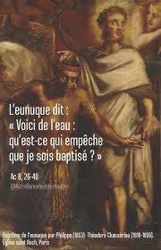 Comme ils poursuivaient leur route, ils arrivèrent à un point d’eau, et l’eunuque dit : « Voici de l’eau : qu’est-ce qui empêche que je sois baptisé ? »