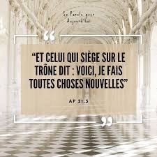 Alors celui qui siégeait sur le Trône déclara : « Voici que je fais toutes choses nouvelles. »