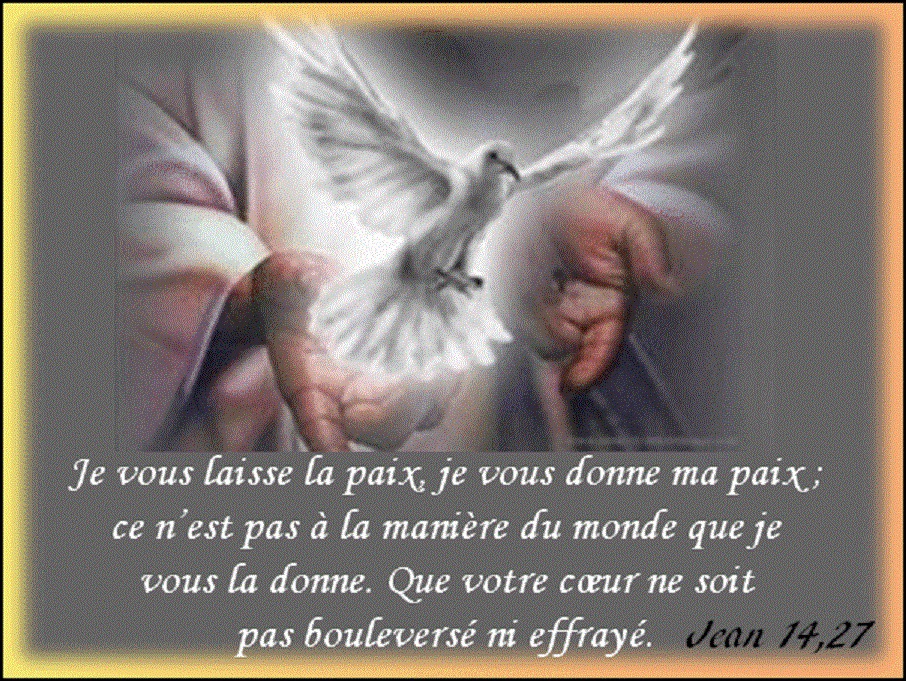 Je vous laisse la paix, je vous donne ma paix ; ce n’est pas à la manière du monde que je vous la donne. Que votre cœur ne soit pas bouleversé ni effrayé.