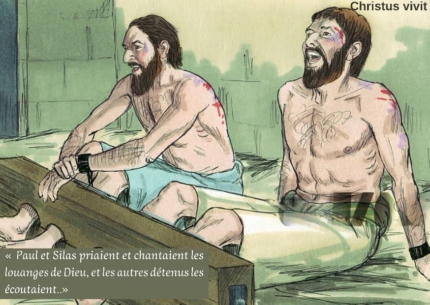 Vers le milieu de la nuit, Paul et Silas priaient et chantaient les louanges de Dieu, et les autres détenus les écoutaient.
