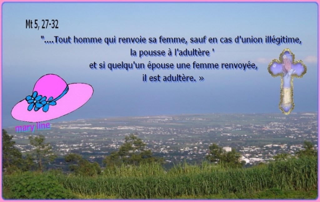 Eh bien ! moi, je vous dis : Tout homme qui renvoie sa femme, sauf en cas d’union illégitime, la pousse à l’adultère ; et si quelqu’un épouse une femme renvoyée, il est adultère. »