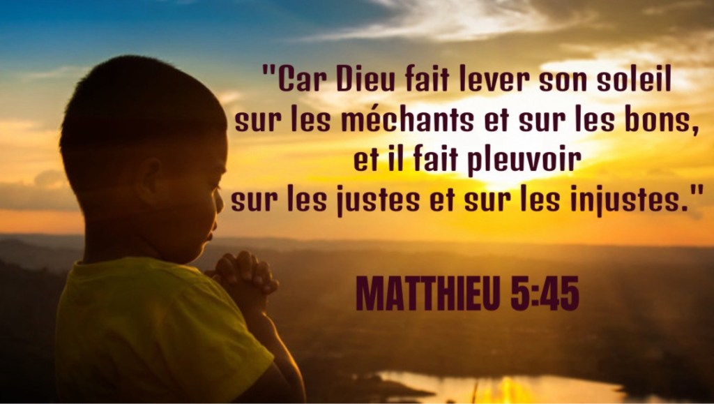 afin d’être vraiment les fils de votre Père qui est aux cieux ; car il fait lever son soleil sur les méchants et sur les bons, il fait tomber la pluie sur les justes et sur les injustes.