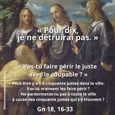 Peut-être y a-t-il cinquante justes dans la ville. Vas-tu vraiment les faire périr ? Ne pardonneras-tu pas à toute la ville à cause des cinquante justes qui s’y trouvent ?