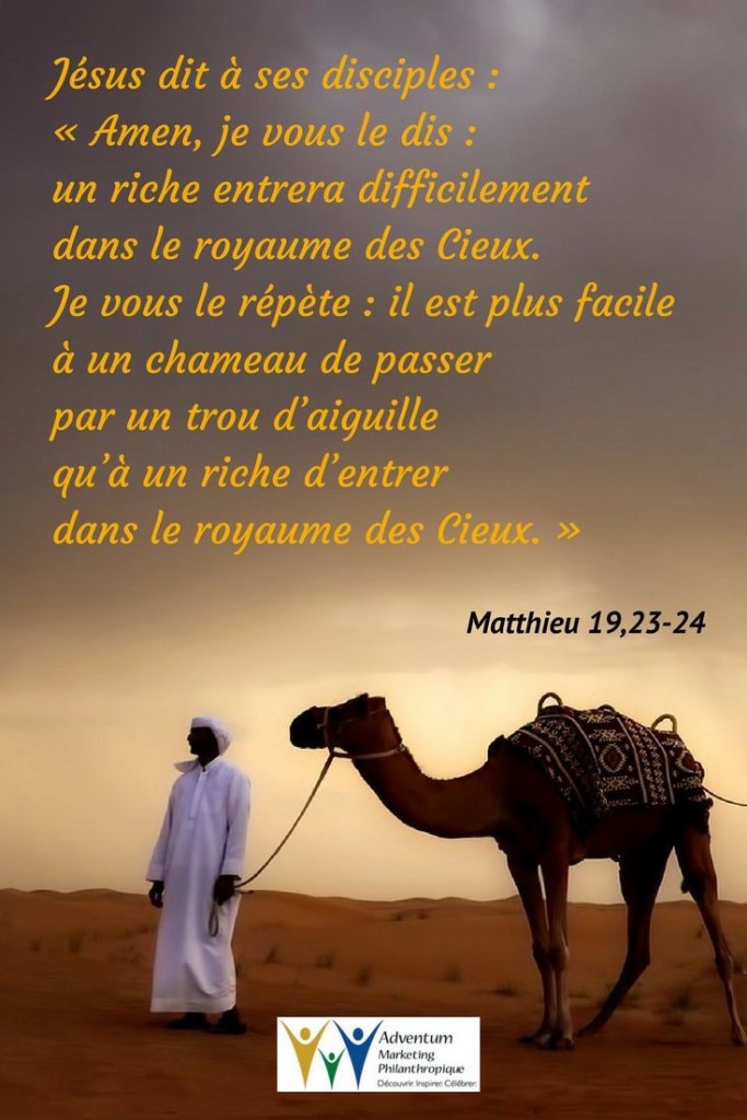Je vous le répète : il est plus facile à un chameau de passer par un trou d’aiguille qu’à un riche d’entrer dans le royaume des Cieux. »