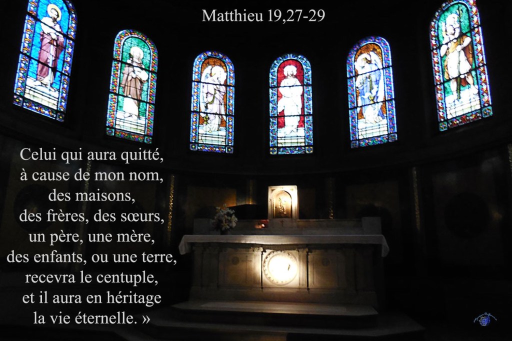 Et celui qui aura quitté, à cause de mon nom, des maisons, des frères, des sœurs, un père, une mère, des enfants, ou une terre, recevra le centuple, et il aura en héritage la vie éternelle.