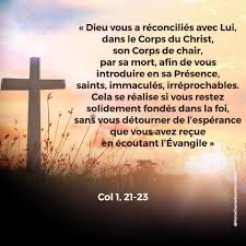 Mais maintenant, Dieu vous a réconciliés avec lui, dans le corps du Christ, son corps de chair, par sa mort, afin de vous introduire en sa présence, saints, immaculés, irréprochables.